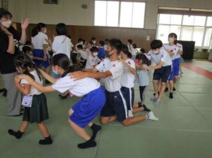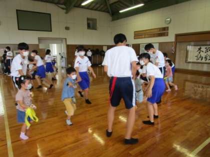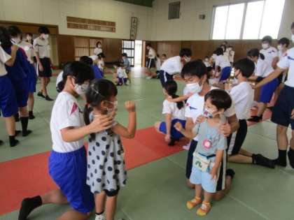 中学生さんとの交流2 公開日 2022/10/04 更新日 2022/10/04 楽しい水橋幼稚園ニュース 中学生さんとペアになり、しっぽ取りやジャンケン列車をしました。体の大きなお兄さんたちが、子どもの背の高さに合わせて腰を低くしながら動いてくださる姿が微笑ましかったです。お互いに名前を覚えて「もう仲良しになっちゃった!」と嬉しそうに話す子もいました。次回の交流会の日も楽しみです。