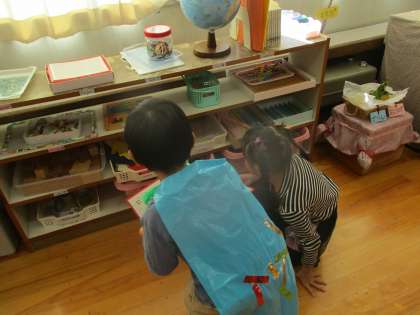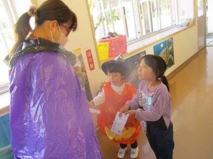 そのあとは絵本でハロウィンの由来についての話を聞き、ミッションゲームに挑戦です。ペアの友達と一緒に4つのミッションをクリアし、最後に園長先生を見つけ「トリック オア トリート!」と言うことができたらお菓子をもらえます。ミッションの中には部屋に隠されたかぼちゃを見付けるという少し難しい内容や、K先生にじゃんけんで勝つといった運が必要なミッションもあり、勝てるまで何度も挑戦していましたよ。
