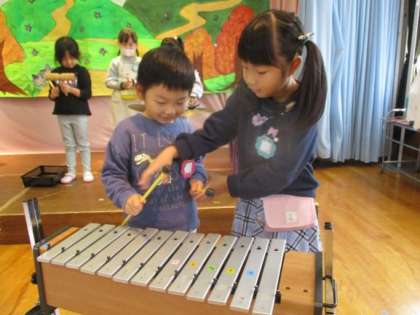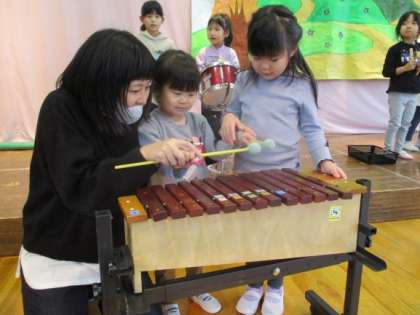 5歳児の合奏を聴いていた3・4歳児もいろいろな楽器に触れたい様子。5歳児のパートに加わることになりました。5歳児にバチの持ち方や、楽器の鳴らし方を隣で優しく教えてもらいながら、みんなで演奏しました。「シンバルが重かったけど楽しかった」「大太鼓、すごく大きな音でびっくりした」「きれいな音でメタルホーンができたよ」と3・4歳児。異年齢の子供たち同士で触れ合う中で、憧れの気持ちや興味関心をもち、いろいろなことをやってみようという意欲につながっています。