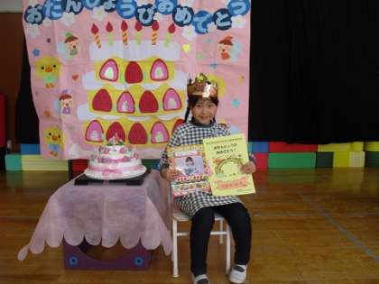 誕生会がありました。1月生まれのお友達をみんなでお祝いしました。インタビューでは好きな果物、ジュース、色、ケーキを聞かれ、じっくりと考えながら答えてくれた誕生児でした。