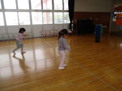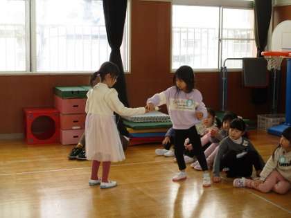 お楽しみコーナーでは、スプーン・れんげレースに挑戦。もも、さくら組はレンゲ、ひまわり組はスプーンを持って、ピンポン玉やスポンジボールを乗せ運び、お友達にバトンタッチです。途中でボールが落ちてもあきらめず次のお友達のところまで運ぶ一生懸命な姿や、「がんばれ!もう少しだよ」と応援する優しい姿が見られ、全員で和やかに楽しむことができました。