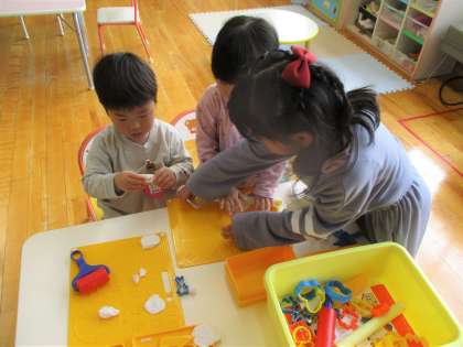 朝から元気に登園してきたもも組さん。遊びたい玩具がたくさんあるようで、朝の支度を先生と一緒に済ませると、すぐに遊び始めました。粘土やクレヨンを使って、夢中になって遊んでいましたよ。ひまわり組のお姉さんがたまに見に来て「粘土を平べったくして型抜きもできるよ!」とやり方を優しく教えてくれていましたよ。
