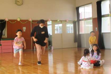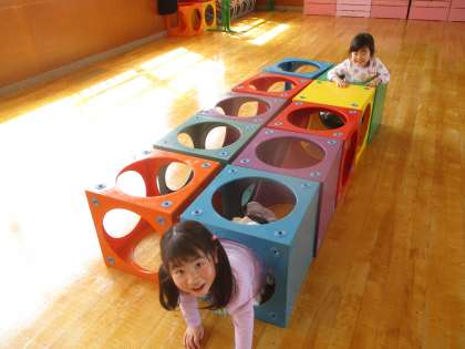 ひまわり組さん、さくら組さんは遊戯室で鬼ごっこやボール遊びをしたり、遊具を並べてトンネルをつくったりして、友達と体をたくさん動かして、汗をいっぱいかきながら遊びました。