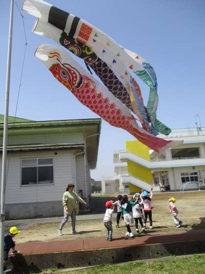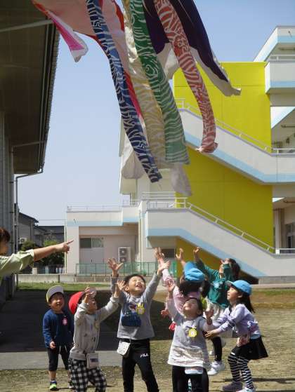 最近は、ほとんど外で見なくなったこいのぼり。今日は箱に眠っていたこいのぼりを起こして、みんなで近くで見てみることにしました。すると、とても大きなお父さんこいのぼりに、子供たちもびっくりしていました。こいのぼりのお腹の中に入ってみると「長いね〜」「きれいな色だね」といろいろな気付きもあったようで、たくさんくぐって遊びました。その後は、園庭に泳がせてみました。いい風が吹き、こいのぼりが高く空に向かって泳ぐと「捕まえたい〜」とジャンプして楽しんでいました。