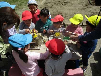 また、園庭では虫捕りをして遊んだり、お友達のつくったタンポポケーキをみんなで食べたりして遊びましたよ。