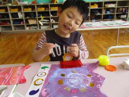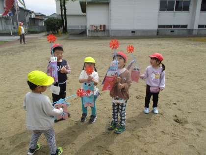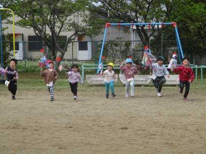 今週から少しずつ作っていたこいのぼりが、ついに完成しました。出来上がると子供たちは「こいのぼりと一緒に走りたい!」と言い、みんなで園庭に出てたくさん走りました。走ると風車がよく回り、その様子が楽しいようです。途中止まってみると「あれ?止まってても風車が回っているよ!どうしてかな?」と不思議に感じ、どこならよく回るのか探していました。風にも興味をもつ機会になればいいなと思います。