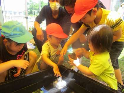 お魚とのふれあい 公開日 2023/06/05 更新日 2023/06/05 楽しい水橋幼稚園ニュース 水橋漁民合同組合の漁師さんたちがたくさんの魚を園に運んで見せてくださいました。初めは、恐る恐るの子供たちでしたが、漁師さんたちが優しく魚のことを教えてくださると、「つるつるしてるね」「ぷにゅぷにゅだ」など、いろいろな魚を触ったり泳ぐ姿を観察したりしました。親子サークルのお友達は、間近に見る魚たちに目をまあるくしながら、親子でじっくりと楽しんでいました。