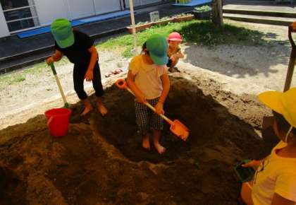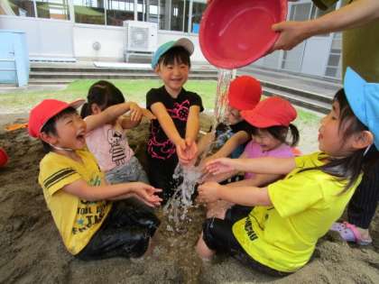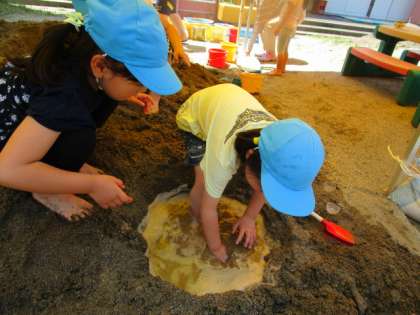 泥んこ遊びをしよう 公開日 2023/06/08 更新日 2023/06/08 楽しい水橋幼稚園ニュース 6月7日(水) 気温が高いと泥んこ遊びがよりダイナミックな遊びになってきました。「大きな温泉にしよう」と砂場を掘り続け、何度も水を運び入れます。ザブーン!と入るといい気持ち。昨日作り置きしておいたバス・ボール(カプセルを泥で包んで乾燥させた)をお風呂に入れてみると「泥で作ったのに浮いてる!何で?」「カプセルの中身は何だろう」とますます好奇心が沸く子供たちです。