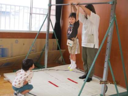 森をつくって遊ぼう2 公開日 2023/09/27 更新日 2023/09/27 楽しい水橋幼稚園ニュース 木にぶら下がったり、しがみついたりした経験を思い出し、高い鉄棒で力を試す姿もあります。何秒ぶら下がっていられるか…目標は昨日の自分を越えること!繰り返し挑戦しています。 トントンの森で、上から栗が落ちてきたスリルを味わったことから、これも遊びに取り入れることにしました。落ちてきても痛くない素材を使い、栗の“イガ”でバルーン遊び(風呂敷で)や玉入れ遊びも楽しい子供たちです。