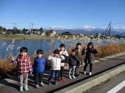 お散歩(12月6日) 公開日 2023/12/06 更新日 2023/12/06 楽しい水橋幼稚園ニュース 立山がとてもきれいだったので、お散歩に出かけました。白岩川の川面がキラキラ輝いたり、水鳥が気持ちよさそうに水中にもぐったりなど、いろいろな発見がありました。公園はすっかりと冬模様でしたが、子供たちはいつものように元気いっぱい!とても心地よいお散歩になりました。