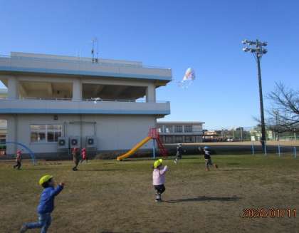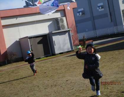 冬も元気いっぱい!(1月11日) 公開日 2024/01/11 更新日 2024/01/11 楽しい水橋幼稚園ニュース 今日は保育参加がありました。ママ先生と風船羽根つきやドッジボールをして、笑顔がいっぱい見られました。いい天気だったので、午後は凧上げをすることにしました。風を感じながら、うまく上がるよう何度も走って試す子。上がった凧を後ろから追いかけて走る子…。冬空の下、みんなで元気に駆け回りました。