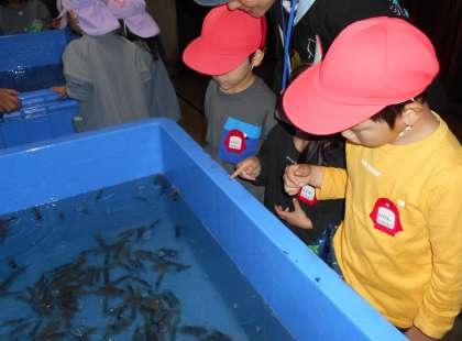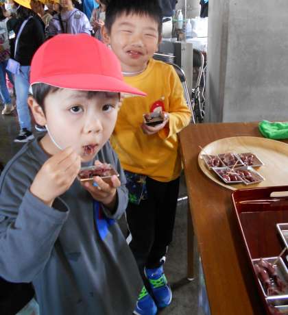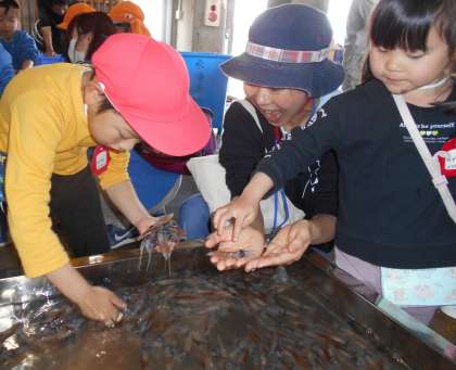 年長児がホタルイカ見学会に出かけました。水槽のホタルイカを触ったり、暗室で光る様子を見たりしました。網ですくった瞬間、青白い光が見えて「わぁ!キレイ」と子供達。泳ぐ姿にも興味津々でした。ゆでたホタルイカの試食もあって「醤油で食べるのが美味しかった」と満足そうでした。園に帰ると、早速、粘土でホタルイカをつくって表現する子もいました。今日の体験をいろいろな遊びに生かしていきたいと思います。