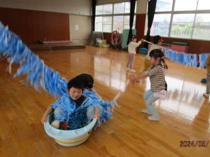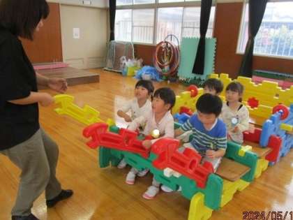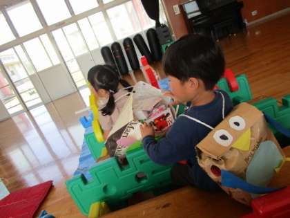 遊戯室で小舟に乗って遊ぶうちに、みんなが乗れる大きな船にしようと考え、大型ブロックで組み立てました。オリジナルリュックをつくって、お弁当を入れ、船に乗って遊んでいます。来週の遠足がとても楽しみなようです。