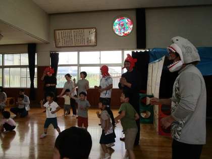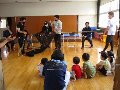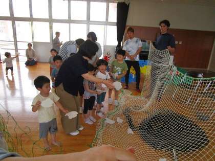 ふれあい体験の後は、漁師のお兄さんたちと交流会をしました。園で海の遊びを楽しんでいる子供たちは、聞いてみたいことがたくさんあり「魚とホタルイカの捕まえ方の違いは?」「深い海の魚はどうやって釣るの?」など、次々と質問しました。すると、漁港から持ってきた大きなたもを使って見せてくれたり、定置網の仕組みを教えてもらい、子供たちも魚になって網に追い込まれてみたりと、実体験を通して知ることができました。