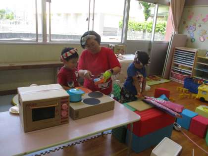 海の遊びをしよう3(6月19日) 公開日 2024/06/19 更新日 2024/06/19 楽しい水橋幼稚園ニュース ままごとが好きな3歳児の子ども達は、釣りの遊びと乗り物ごっこが融合し、釣った魚を運搬して調理する遊びを楽しんでいます。魚をさばいてお客さんにふるまうやり取りもみられます。
