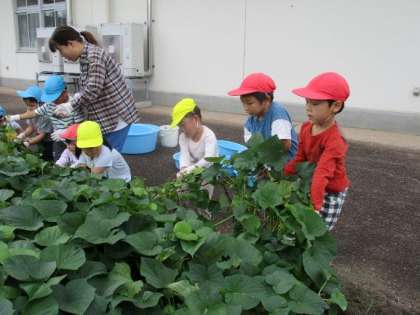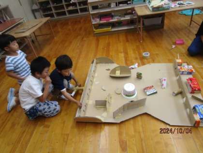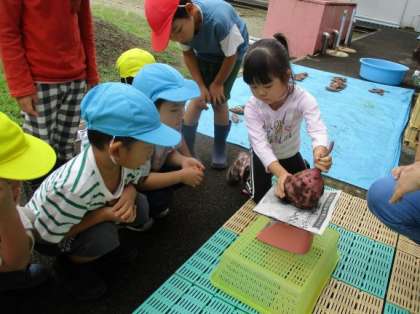 中学生との交流会で遊んだおもちゃをヒントに「ドングリ転がしゲーム」をつくり始めています。ハンドルを動かしてねらった所までドングリを転がそうと試行錯誤する子どもたちです。今日は、サツマイモ堀りをしました。一番大きくて重いイモはどれか予想し、量りで測定したところ、910グラムのおイモキングが決定しました!