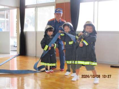防火教室では、火遊びしないことや、火事が起きたときは煙害にあわないよう身を守りながら避難することなどを学びました。消防服を着て放水のポーズをとり、消防士の気分も味わうことができました。