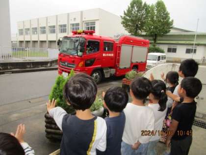 水橋消防署より、避難訓練の様子を見に来ていただきました。園のどこで遊んでいても近くにいる先生と一緒に避難することを約束しました。