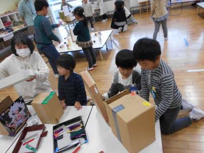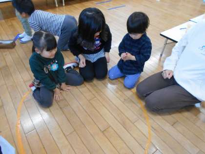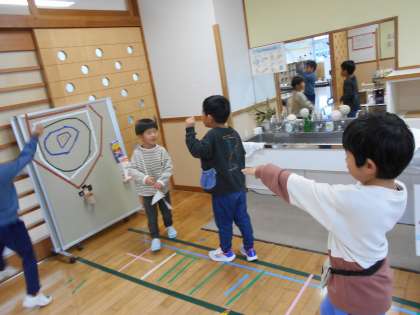 水橋中部小学校1年生の「あきのおもちゃまつり」に招待されました。秋の宝物(自然物)を使った「オナモミダーツ」「マツボックリのけん玉」「ドングリコースター」など、面白そうなおもちゃがいっぱいで、子供たちは興味津々。お兄さんお姉さんが、遊び方をやさしく教えてくれたので、次々と挑戦していました。幼稚園でも遊んだドングリや落ち葉が、こんな風に工夫すると楽しい遊びができるんだと知り、園に戻ってからも「つくってみたい」とやる気満々でした。今度また一緒に遊ぶ約束もし、その日が待ち遠しい子供たちです。