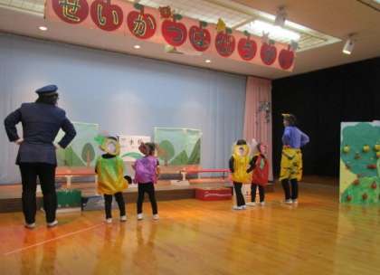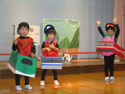 3歳児は、大好きな電車に乗って生き生きと演じました。