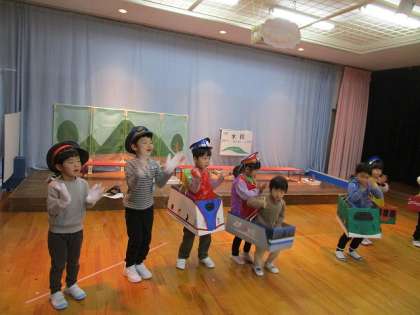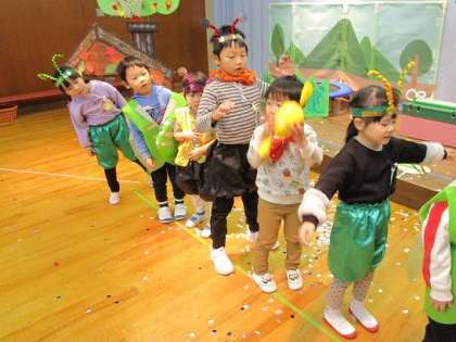 生活発表会を終え、今度はお互いのクラスの劇ごっこを一緒に楽しみました。やってみたい役が決まっていたようで、歌も踊りもよく覚えていて、張り切って演じていました。