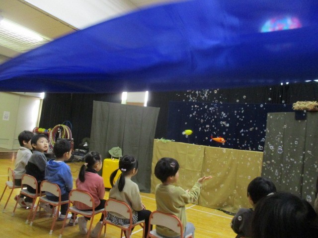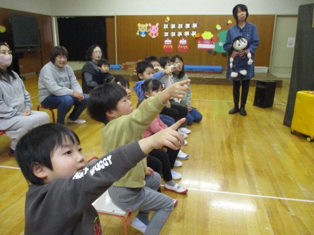 楽しい人形劇(1月14日) 公開日 2025/01/14 更新日 2025/01/14 楽しい水橋幼稚園ニュース 劇団chocolat☆ショコラによる人形劇を観劇しました。「おいしいぼうし」というお話では、子供たちが主人公と一緒になって帽子を探す仕草が、とても温かく感じられました。乳幼児期に十分にお話の世界に浸れることが大切であると改めて思えるひと時でした。