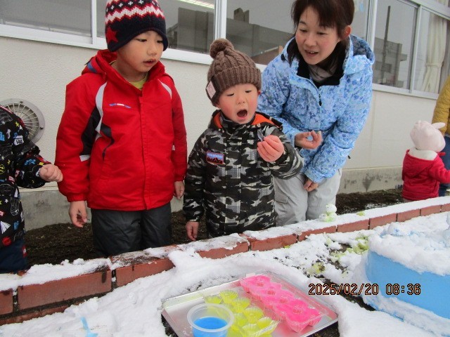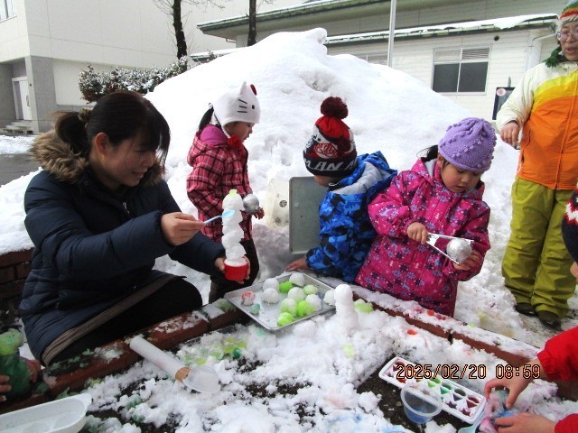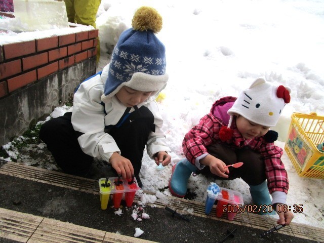 色水と雪を使って、アイスづくりも始まりました。カラフルなアイスをつくる子や、4段アイスに挑戦する子もいました。4・5歳児がしていることに3歳児も興味をもち「僕もやりたい」「どうやるの」と自分から声をかけてやってみようとする姿もありました。