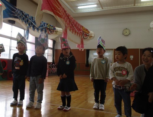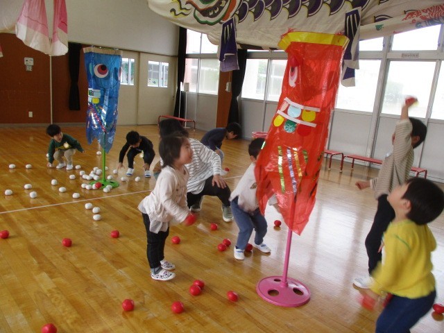 また、5日のこどもの日のお話を聞き「もっと元気に、もっと大きくなりたいな!」と、みんなで鯉の滝登りゲームや玉入れを楽しみました。空を泳ぐこいのぼりのように、子供たちが健やかに成長しますように!