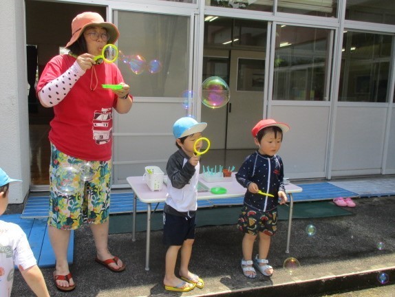 はじめはシャボン玉や水鉄砲の的当てをしていた子供たちもどんどんダイナミックに遊ぶようになり、友達と追いかけごっこをしながら水を掛け合ったり、水中キック、最後は頭から思い切り水をかぶっていました。「気持ちいいね」「また入りたいね」と笑顔があふれていました。