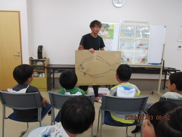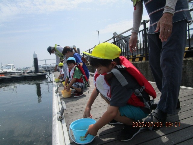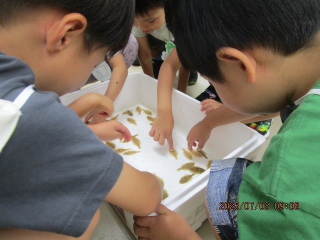 ヒラメの放流体験1(7月3日) 公開日 2025/07/03 更新日 2025/07/03 楽しい水橋幼稚園ニュース 4・5歳児は、水橋フィッシャリーナでヒラメの放流体験をしました。ヒラメについて説明を聞いた後、7~8センチの稚魚に触れ「かわいい!」「ツルっとしてる」と嬉しそうな子どもたち。バケツに入った稚魚を「おおきくなってね。バイバイ」と放し、海の底へヒラヒラと泳いでいく姿が見えなくなるまで見送りました。