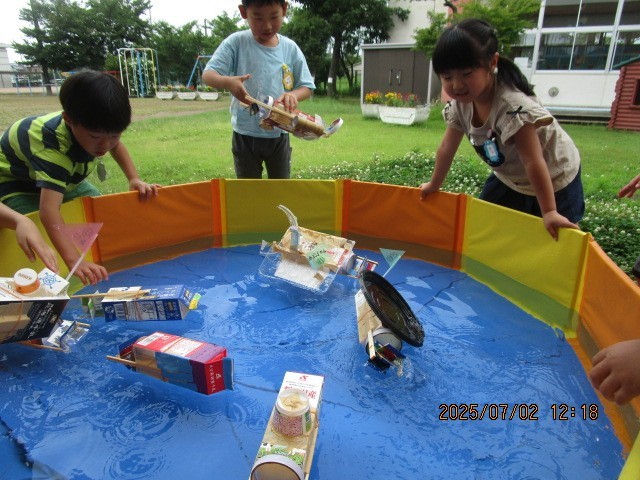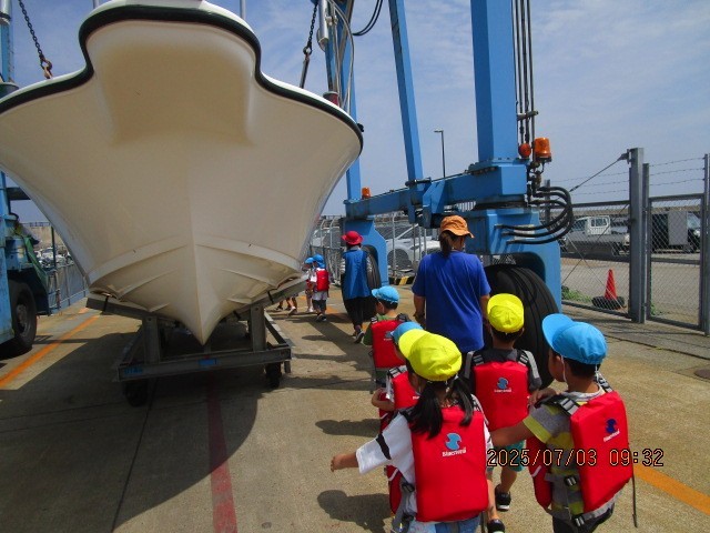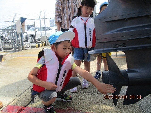 フィッシャリーナには大きな船がズラリと並んでいて「あの船がかっこいいなぁ」「乗りたいな」と憧れの眼差しで見る子どもたち。船体を引き上げてもらい「船の後ろにあるスクリューで水をかいて進むんだよ」と教えてもらいました。幼稚園では、丁度、プロペラで動く船をつくって水遊びをしていることもあり、本物の船の構造に興味津々。園に帰ると早速、船のプロペラの動きを試して遊ぶ様子が見られました。