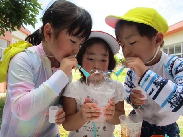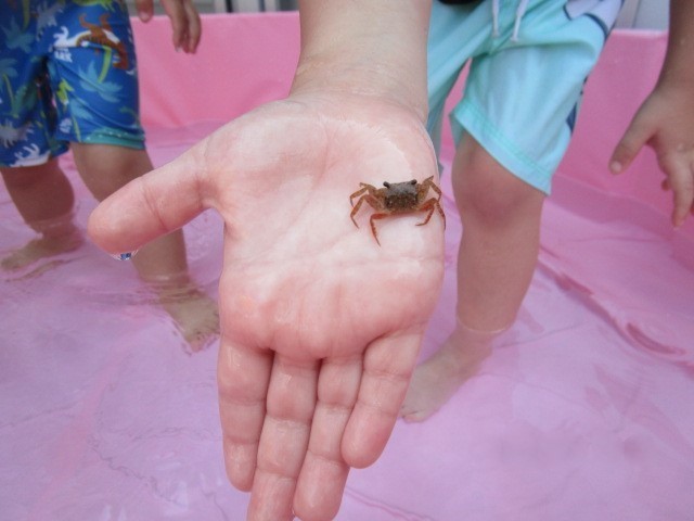 水遊びをしていたテラスで、カニを見付けた子どもたち。「大きいのと、小さいのがいるよ」「一緒にプールで遊びたい!」と大はしゃぎ。優しく手で触れたり、自分の作った船に乗せてあげたりしました。「きっと幼稚園が好きなんだね」「カニさんもお友達」と嬉しそうな子どもたちでした。日陰でのシャボン玉、泡遊びも楽しんでいます。暑さの状態をみながら、今の時期ならではの遊びを楽しめるようにしていきたいと思います。