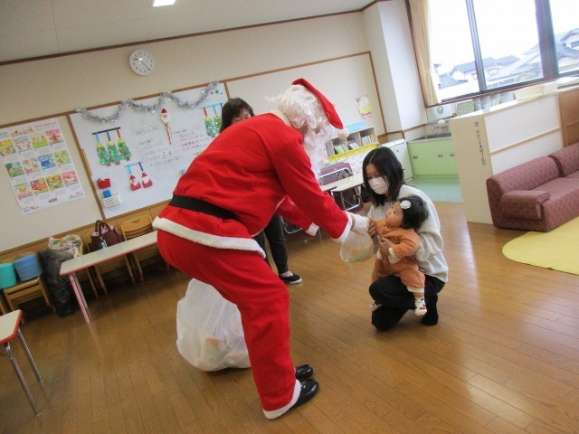 プレゼントをもらうときには、サンタさんの顔をじっと見ている子がほとんどでしたが、お家の方と一緒にプレゼントをもらうと嬉しそうな様子でした。ジングルベルの曲に合わせて鈴を鳴らしたり、手遊びをしたりして楽しいクリスマス会になりました。