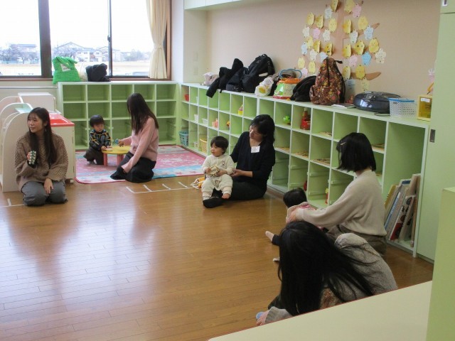今日の親子サークルは、みんなが楽しみにしていたクリスマス会!鈴の音が聞こえくると、サンタクロースが大きなプレゼントの袋を持って登場して、お家の方からは拍手がおこりました!