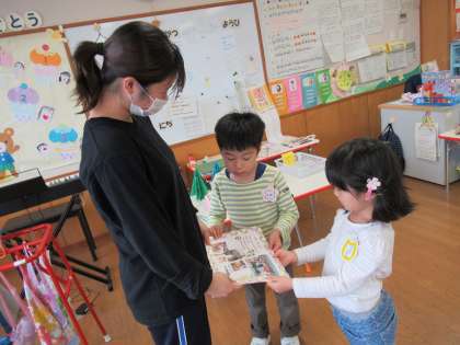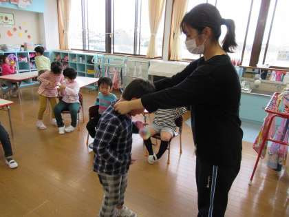 今日は実習生とのお別れ会をしました。絵本やエプロンシアターを見せてもらい、一人ずつメダルのプレゼントをもらいました。「虹色のメダルだ」「この色好き」とメダルを見せ合って喜んでいた子供たちです。最後に子供たちからもプレゼントを渡しました。