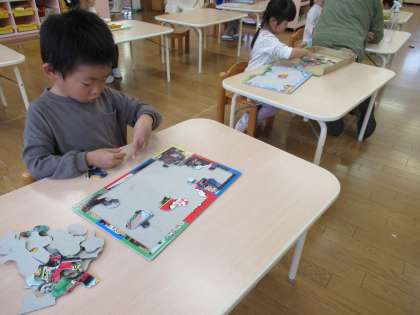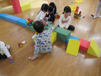 今日は発表会の確認をした後、たくさん遊びました。最近はカラー積み木を道路にして、車を走らせています。ブロックを並べて家や街をつくっている子もいますよ。また、新しいパズルに興味津々で取り組む子もいて、伸び伸びと遊びました。