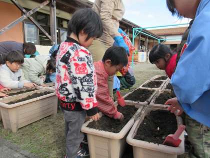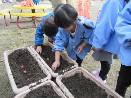 今日はたんぽぽ組の友達と一緒に球根を植えました。球根に優しく土を被せるように伝えると、みんなそーっと土を被せてあげていましたよ。春になったらきれいなチューリップが咲くようにお願いもしました。春が来るのが楽しみですね。