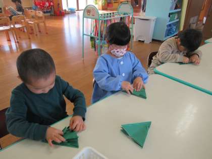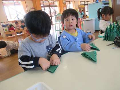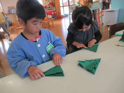 クリスマスツリーをつくっています(たんぽぽ組) 公開日 2020/12/02 更新日 2020/12/02 1日の生活 12月2日(木) 今回は折り紙を使って、立体的なクリスマスツリーをつくっています。ツルを折るように袋織りをしてつくっていくのですが、なかなかうまく折れずに先生に教えてもらったり友達同士で見せ合ったりしていました。