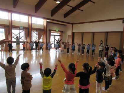 クリスマス会に向けて 公開日 2020/12/04 更新日 2020/12/04 1日の生活 12月4日(金) 今日はプレイルームで、クリスマス会で踊る「まってます、クリスマス」を踊りました。話しを聞いた後に、みんなで輪になり、友達や先生の顔を見ながら楽しそうに踊っていました。終わった後も口ずさんでいる子がたくさんいましたよ。クリスマス会が待ち遠しいですね。