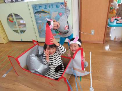 今日もオオカミと10匹の子ヤギごっこをしました。家の中にテーブルが増え、ゆっくりご飯を食べている子がいたり、オオカミに見付からないように時計の中に隠れたりする子がいました。そして、今日はなんと子ヤギの家にサンタさんが来ました!良い子にしている子ヤギはプレゼントをもらっていましたよ。