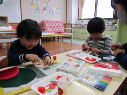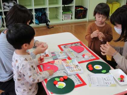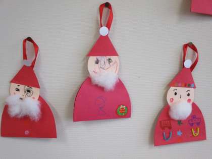 親子サークル 公開日 2020/12/09 更新日 2020/12/09 1日の生活 12月8日(火) 今日の親子サークルは、クリスマスの飾りをつくりました。クレヨンで顔を描いて赤い画用紙をつけるとサンタクロースの出来上がり。緑色の土台に飾りを貼っていくと、素敵なリースになりました。クリスマスが来るのが楽しみですね。