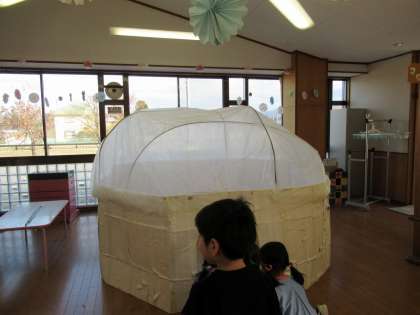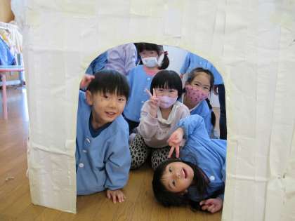 午後からは冬の遊びづくりを楽しみました。みんなで白い紙を貼っていた大きな段ボールを組み立て、大きなかまくらができてきました。今日はみんなで入ってみましたが、みんなで入っても広くて、中で寝転がったり「みかんどうぞ」「ゲームしたい」とくつろいでいた子供たちです。