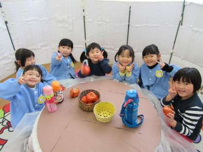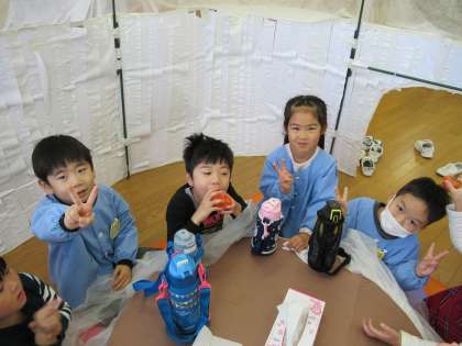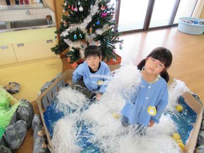 かまくらの中のこたつが完成し、みんなで入ってゆっくりおしゃべりタイム。「水筒もってきたよ」「みかん食べよう」と様々なものを持ち込み「温かいね」と嬉しそうでした。温泉も入ってみると温かく、順番に入って楽しみました。