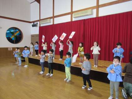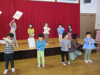 新しい友達に会えるのってうれしいね!(たんぽぽ組) 公開日 2020/12/18 更新日 2020/12/18 1日の生活 12月18日(金) 来月の新入園児説明会に向けて、手遊びや歌を歌いました。発表会の時にしたものなので、すぐに思い出してしていました。「ぼくの弟も来るよ」「もうすぐだね」「楽しみ!」と話していました。このような経験を通して、少しずつ年長組になる気持ちを高めていってくれたらと思っています。