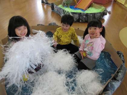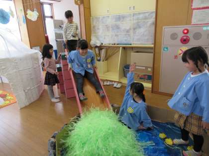 滑り台付きのお風呂をつくりたいと以前から話していた子供たち。昨日の午後にみんなで滑り台を運び、高さを調節しながら設置しました。今日は「楽しい」と何度も繰り返し滑り、ほし組の友達も遊びに来てくれました。