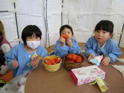 かまくらの中では、ポテチやアイスクリーム、ケーキやお煎餅など、自分たちの食べたいものをつくりみんなで分け合って食べていましたよ。