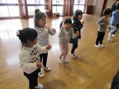 今日はプレイルームでたんぽぽ組の友達と一緒に「まってますクリスマス」を踊ったり「十二支の歌」を歌ったりしました。お兄さんお姉さんに誘われて一緒に歌うほし組さんは少し緊張しているような、嬉しそうな表情をしていました。
