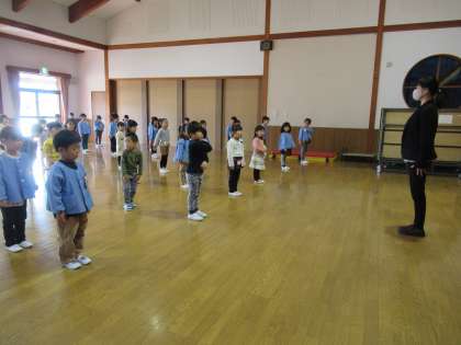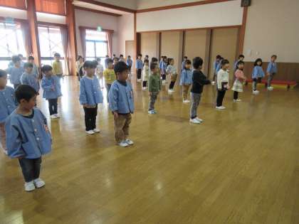 今日で2学期も終わりです。運動会や発表会と大きな行事を経験し、心も体も成長しましたね。終業式では、園長先生と冬休みの約束をしました。