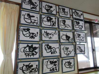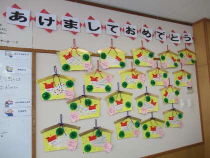 今年は書初めの代わりに筆で牛の絵を描きました。今年一年頑張りたいことも絵馬に書き、今日は一人ずつ発表しました。