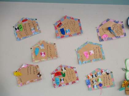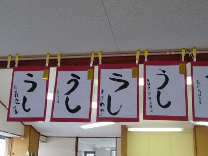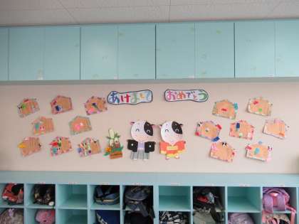今日は英語教室やかるたづくり、当番活動の引継ぎの準備をしました。先日書いた絵馬と書初めも全員完成し、部屋に掲示しました。友達の作品を見て「折り紙かわいいね」「字上手だね」と話していた子供たちです。